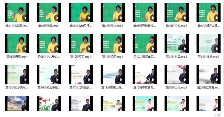 本资源为《摩比网校:摩比爱古诗》全172节视频课合集[MP4]百度云网盘下载,本次资源格式为MP4,做压缩包处理,避免资源丢失,不要直接在网盘解压,请先保存下载再解压便可播放。