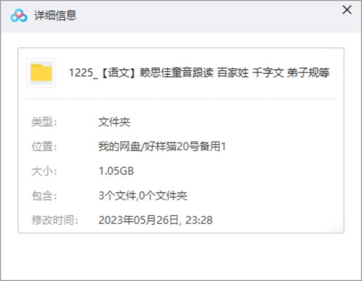 本资源为《赖思佳童音跟读》百家姓/论语/弟子规等资源合集[MP3]百度云网盘下载,本次资源格式为MP3,做压缩包处理,避免资源丢失,不要直接在网盘解压,请先保存下载再解压便可播放。