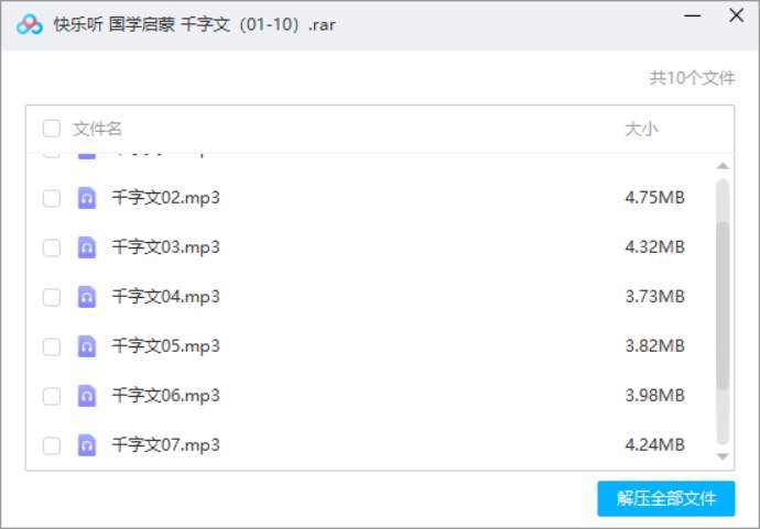 本资源为《快乐听 国学启蒙千字文》全20讲音频合集[MP3]百度云网盘下载,本次资源格式为MP3,做压缩包处理,避免资源丢失,不要直接在网盘解压,请先保存下载再解压便可播放。