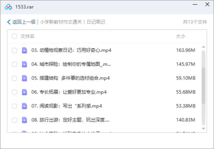 本资源为《小学新教材作文通关|日记周记》全12节视频课合集[MP4]百度云网盘下载,本次资源格式为MP4,做压缩包处理,避免资源丢失,不要直接在网盘解压,请先保存下载再解压便可播放。