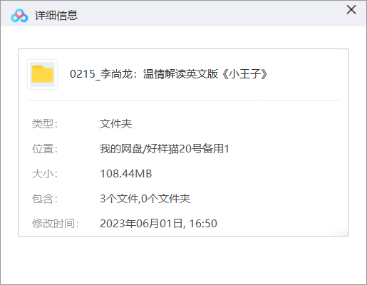 本资源为李尚龙:英文版《小王子》温情解读全11讲音频合集[M4A]百度云网盘下载,本次资源格式为M4A,做压缩包处理,避免资源丢失,不要直接在网盘解压,请先保存下载再解压便可播放。