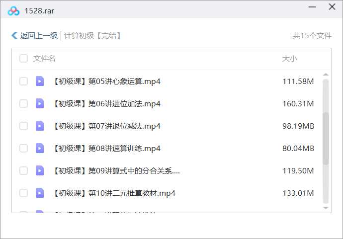 本资源为《小学生数学计算方法和技巧》初级+高级全30节视频课[MP4]百度云网盘下载,本次资源格式为MP4,做压缩包处理,避免资源丢失,不要直接在网盘解压,请先保存下载再解压便可播放。