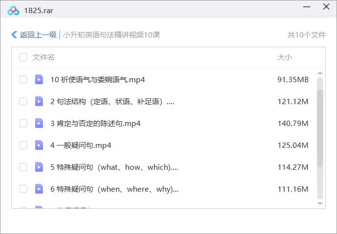 本资源为《小升初英语句法精讲》全10节视频课合集[MP4]百度云网盘下载,本次资源格式为MP4,做压缩包处理,避免资源丢失,不要直接在网盘解压,请先保存下载再解压便可播放。