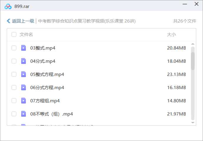 本资源为《中考数学综合知识点复习》全26节视频课合集[MP4]百度云网盘下载,本次资源格式为MP4,做压缩包处理,避免资源丢失,不要直接在网盘解压,请先保存下载再解压便可播放。