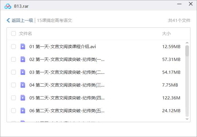 本资源为《15课搞定高考语文》全41节视频课合集[AVI]百度云网盘下载,本次资源格式为AVI,做压缩包处理,避免资源丢失,不要直接在网盘解压,请先保存下载再解压便可播放。