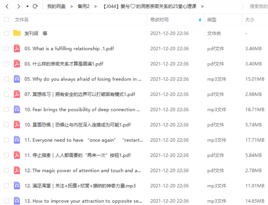 本资源为爱与性的秘密,洞悉亲密关系的25堂心理课音频合集[PDF/MP3]百度云网盘下载,本次资源格式为MP3,资源做压缩包处理,为避免资源丢失,不要在线解压,请先保存在下载解压便可播放试听。