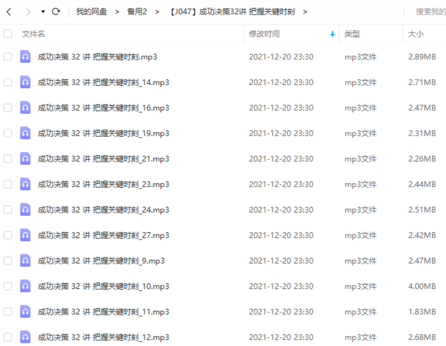 本资源为成功决策32讲,把握关键时刻有声音频打包合集[MP3]百度云网盘下载,本次资源格式为MP3,资源做压缩包处理,为避免资源丢失,不要在线解压,请先保存在下载解压便可播放试听。