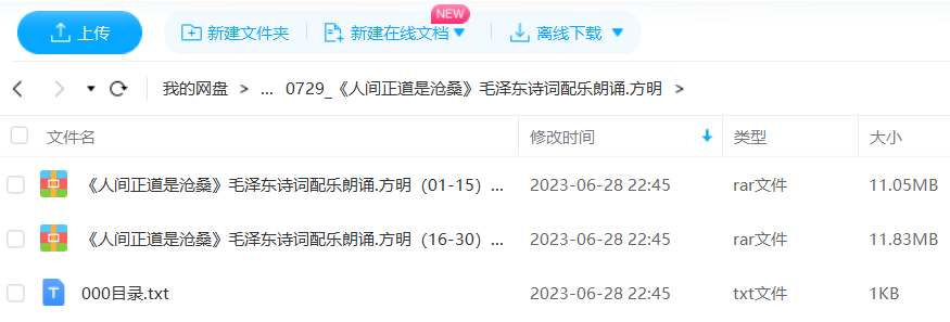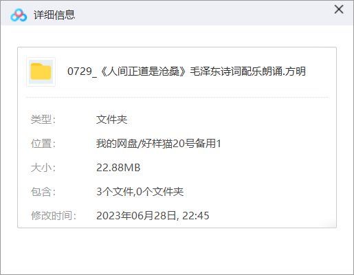 本资源为《毛泽东诗词配乐朗诵-方明》全30讲音频合集[MP3]百度云网盘下载,本次资源格式为MP3,做压缩包处理,避免资源丢失,不要直接在网盘解压,请先保存下载再解压便可播放。