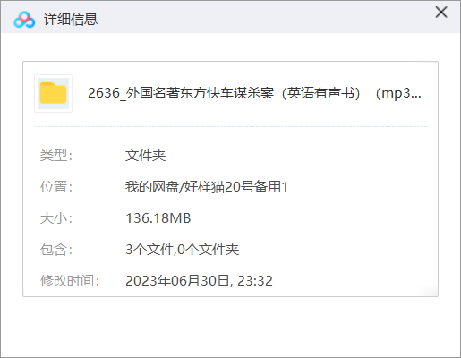 本资源为《外国名著东方快车谋杀案》英语有声书全12回音频合集[MP3]百度云网盘下载,本次资源格式为MP3,做压缩包处理,避免资源丢失,不要直接在网盘解压,请先保存下载再解压便可播放。
