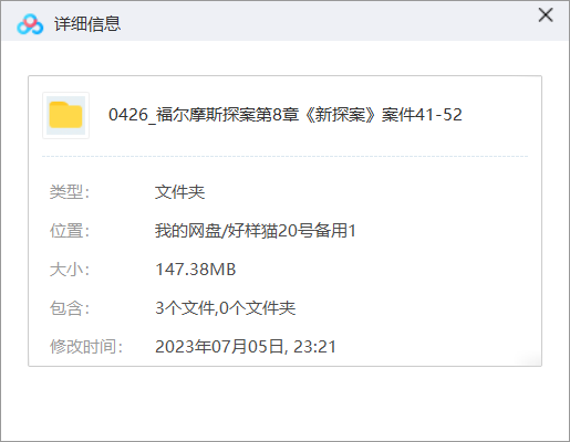 本资源为福尔摩斯探案第8章《新探案》案件41-52回音频合集[MP3]百度云网盘下载,本次资源格式为MP3,做压缩包处理,避免资源丢失,不要直接在网盘解压,请先保存下载再解压便可播放。