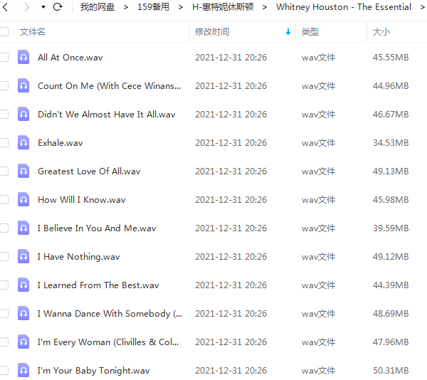 本资源为美国女歌手惠特妮·休斯顿/Whitney Houston精选歌曲合集-6张专辑无损音乐打包[WAV/4.34GB]百度云网盘下载,一共收录6张专辑100首歌曲,歌曲格式为WAV,按专辑做压缩包处理,为避免资源丢失,不要在线解压,请先保存在下载解压便可播放试听。