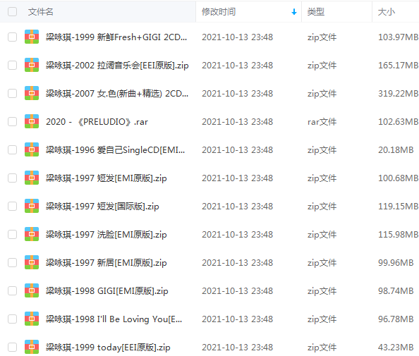 本资源为梁咏琪专辑所有歌曲合集-34张专辑(1996-2020)高音质音乐打包[MP3/4.36GB]百度云网盘下载,一共包梁咏琪专辑所有歌曲合集-34张专辑,歌曲格式为高音质MP3,按专辑做压缩包处理,需要会员下载解压便可播放试听。