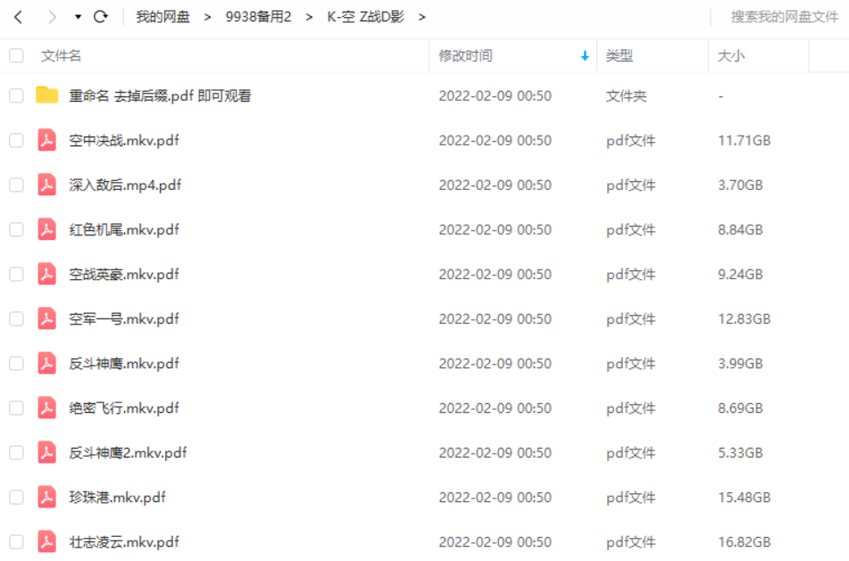 本资源为1986-2010年10部经典空战题材电影英语中文字幕超清合集[MKV/MP4]百度云网盘下载,本次资源格式为MKV+MP4,做压缩包处理,避免资源丢失,请先保存下载再解压便可播放。(保存到自己的网盘后,重命名文件,后缀去掉 .pdf 即可播放)