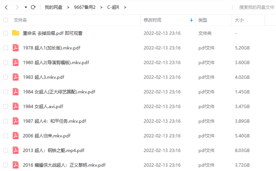 本资源为《超人》系列1978-2016年8部电影英语中文字幕合集[AVI/MKV/MP4]百度云网盘下载,本次资源格式为AVI+MKV+MP4,做压缩包处理,避免资源丢失,请先保存下载再解压便可播放。(保存到自己的网盘后,重命名文件,后缀去掉 .pdf 即可播放)