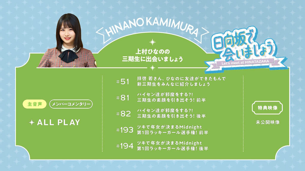 洋題:LET`S MEET AT HINATAZAKA KAMIMURA HINANO NO SANKISEI NI DEAIMASHOU