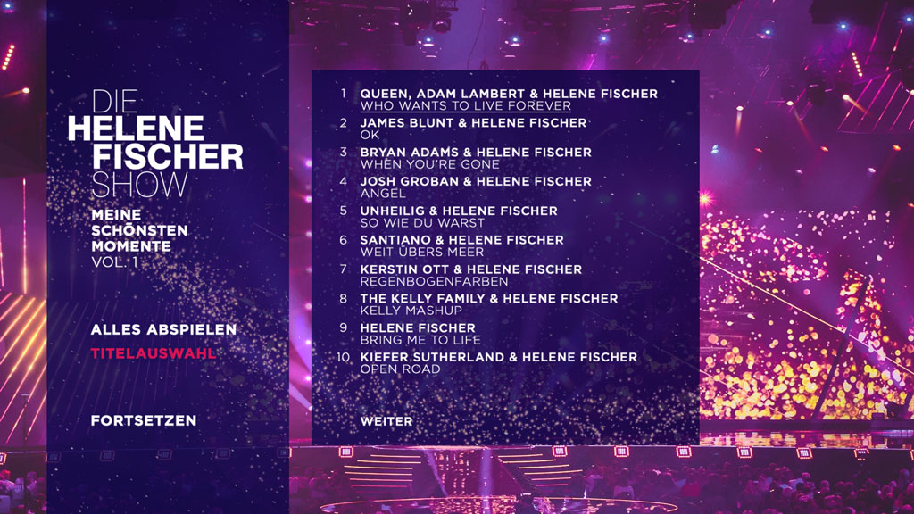 И самое лучшее: Отныне “The Helene Fischer Show – My most beautiful moments” также и для дома – 40 песен, отобранных самой Хеленой Фишер, собранных на эксклюзивном двойном альбоме. С уникальными дуэтами, классикой и мега хитами из ее звездной шоу-программы и множеством мурашек по коже.
