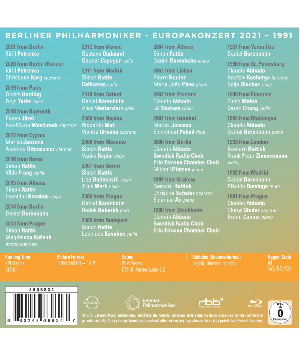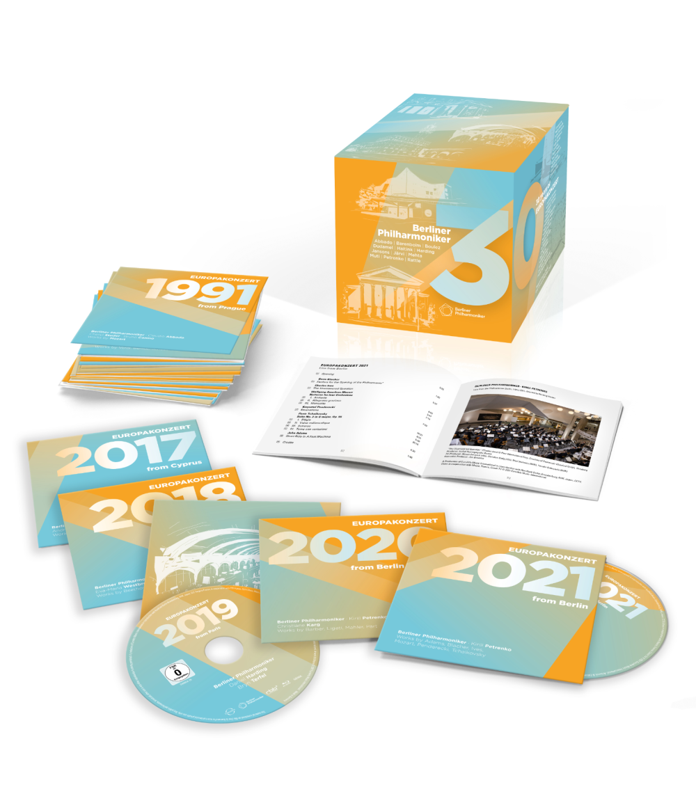 The EUROPAKONZERT celebrates the founding of the Berliner Philharmoniker on 1 May 1882 and takes place in a different location of cultural history each year. In celebration of 30 years of EUROPAKONZERT, this box set features more than 48 hours of world-class classical music on 31 Blu-ray discs, including the 2020 concert from the pandemic year as well as the never-released anniversary concert from Berlin from 2021. Many conductors and famous soloists have participated in the Europakonzert over the years, thereby creating a memorable uniqueness in every concert. Additional and extensive documentaries about the respective European cities in which the concerts took place, enrich a large number of the included Blu-rays.