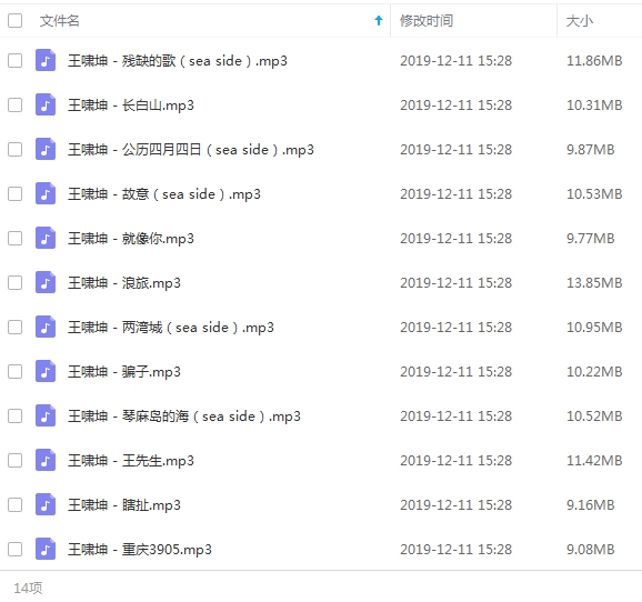 本资源为王啸坤精选音乐专辑《三十王十三》13首歌曲[高音质MP3/140.88MB]百度云网盘下载,包含王啸坤专辑《三十王十三》13首歌曲,歌曲格式为高音质MP3,按专辑做压缩包处理,需要会员下载解压便可播放试听。