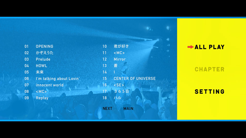 ■本作は、ライブ映像作品という点において、彼らが音楽に傾けるエネルギーの総量の全てを過去最大級に集約する事に成功している。初映像化となる「蒼」「ハル」の他、ALBUM「SENSE」収録以外では「未来」「innocent world」「Replay」「君が好き」「Mirror」「CENTER OF UNIVERSE」「ニシエヒガシエ」「Everything is made from a dream」「星になれたら」「Tomorrow never knows」「終わりなき旅」他数々の名曲を収録。全26 曲収録予定。