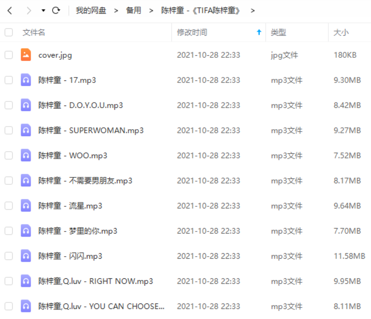 本资源为陈梓童2019个人首张创作专辑《TIFA陈梓童》歌曲合集[高音质MP3]百度云网盘下载,《TIFA陈梓童》专辑歌曲格式为MP3,专辑做压缩包处理,会员下载解压便可播放试听。