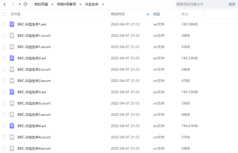 本资源为BBC《冷血生命》纪录片1-5集英语中文字幕打包合集[AVI]百度云网盘下载,本次资源格式为AVI,做压缩包处理,避免资源丢失,请先保存下载再解压便可播放。