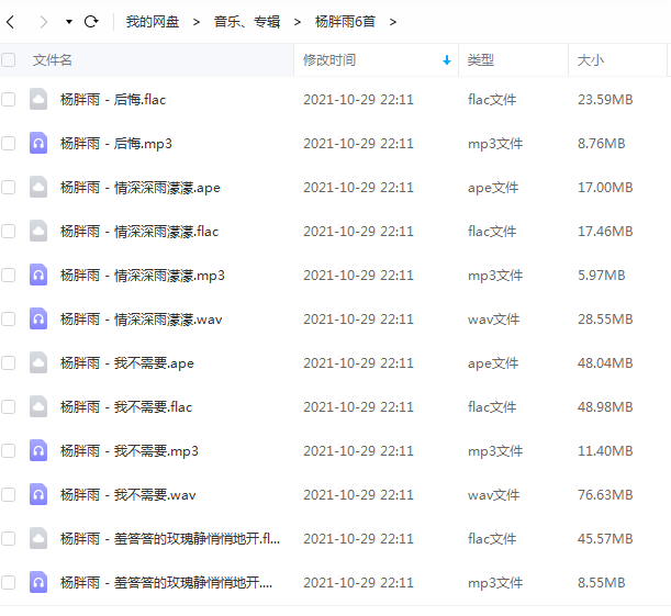 本资源为抖音杨胖雨歌曲合集-精选6首流行单曲[FLAC/WAV/MP3/594.77MB]百度云网盘下载,包含,歌曲格式为WAV+FLAC+MP3,按专辑做压缩包处理,为避免资源丢失,请先保存下载解压便可播放试听。