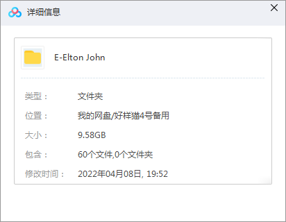 本资源为艾尔顿·约翰/Elton John经典流行歌曲合集-60张专辑(1971-2008)高音质音乐打包[MP3/9.88GB]百度云网盘下载,包含艾尔顿·约翰/Elton John经典流行歌曲合集-60张专辑,歌曲格式为FLAC/MP3,按专辑做压缩包处理,为避免资源丢失,不要在线解压,请先保存在下载解压便可播放试听。