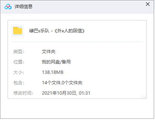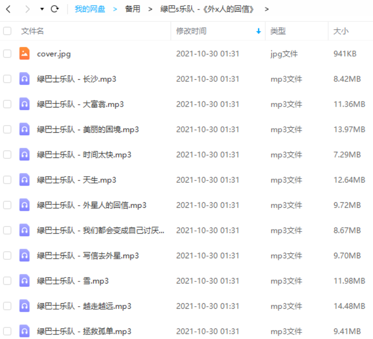 本资源为绿巴士乐队单张专辑《外星人的回信》精选13首歌曲[高音质MP4]百度云网盘下载,《外星人的回信》歌曲格式为高音质MP3,专辑做压缩包处理,避免资源丢失,请先保存下载在解压便可播放试听。