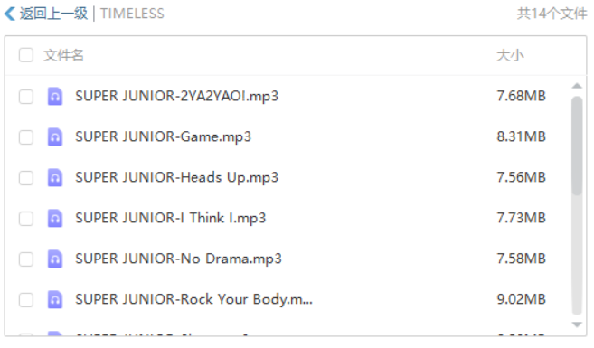 本资源为SUPER JUNIOR单张专辑《TIMELESS》精选14首歌曲[高音质MP3]百度云网盘下载,《TIMELESS》专辑歌曲格式为高音质MP3,专辑做压缩包处理,避免资源丢失,请先保存下载在解压便可播放试听。