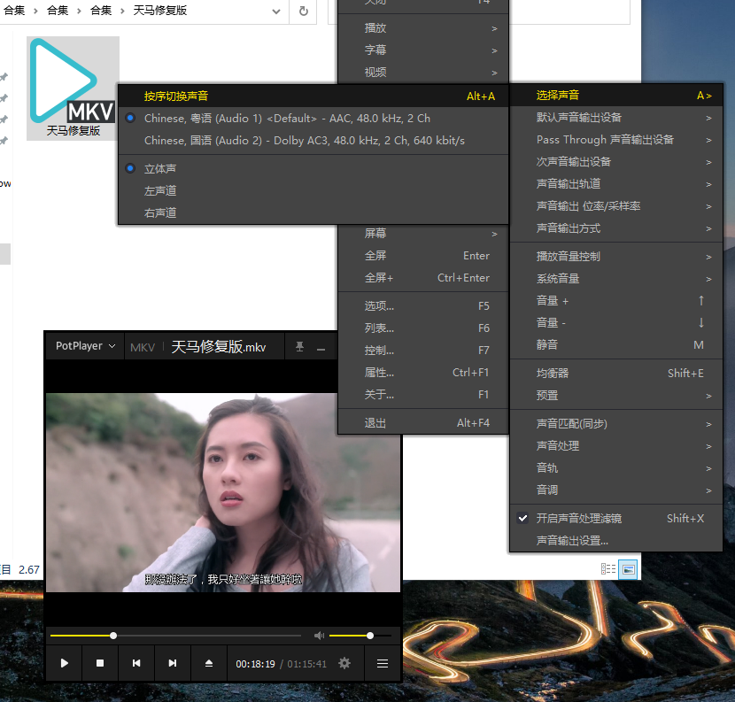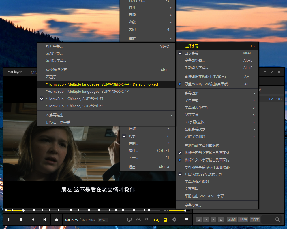 此时我们应该先把电影下载下来,用可以选择字幕和音轨的播放器来播放。在此推荐使用Potplayer或QQ影音,当然前者是最好的,只不过有点复杂。在画面上点右键就可以选择字幕或者音轨了,如果封装了的话。