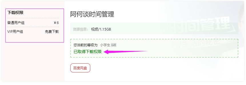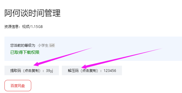 2,再点“百度网盘”按钮即可跳转到资源的下载信息页面。注意,此处显示提取码,若是加密压缩包,则还会显示解压密码。
